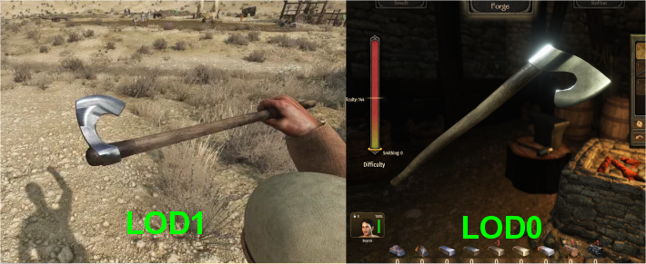 For weapons game uses LOD1 in battle and LOD0 in crafting menu.
